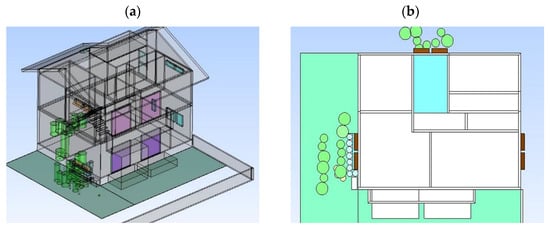 The experiment results at 12:00 on 29 August 2014 were selected as the validation case in this study. Figure 5 illustrates the 3D model of the entire experiment site. Inside the house, the floor plans of the first and second floors were based on the real layout of the house, with all the doors kept closed, except for the sliding door in the stair hall.