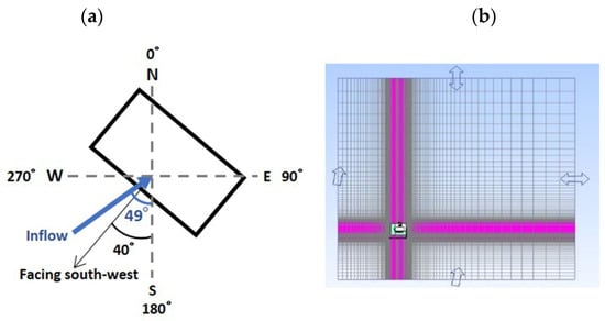 Flow conditions of the experiment and simulation conducted in this study: (a) direction of the inflow; (b) computational grids.