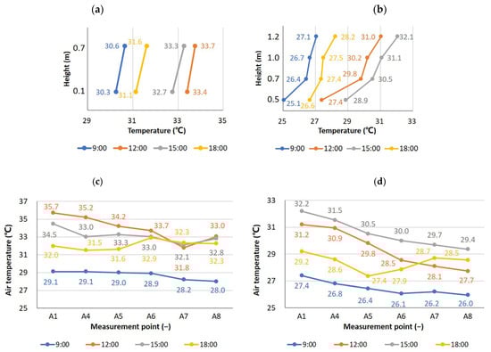 The simulated vertical temperature distributions of Case 0 and 1 at 12:00 on 29 August are shown in Figure 15a. It should be noticed that huge temperature differences exist in front of the floor-level windows, particularly near the surface of the water retentive block where the maximal temperature difference is more than 3 °C at GL + 0.5 m. This verified that the semi-outdoor space in front of the floor-level windows was cooled off by the passive cooling design. However, the water retentive block hardly affected higher space at a height of 0.2 m above the height of block surface (GL + 0.5 m), since the temperature difference at GL + 1 m was smaller than those at lower points, as shown in Figure 15a; it was mainly influenced by the plants and dripping pipe. Regarding the horizontal temperature distribution, as shown in Figure 15b, the temperature of Case 1 decreases sharply from the measurement point of A4 to A5; the difference from that of Case 0 is more than 1.5 °C at A5. Regarding the temperature distribution across the house of Case 1 and Case 0, as illustrated in Figure 15c,d, respectively, the indoor temperature in the middle of the living room of Case 1 is lower than that of Case 0 by about 0.4 °C. Thus, the passive cooling design was confirmed to be effective in reducing the temperature.