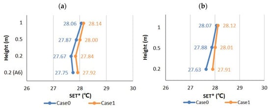 Evaluation results in terms of SET* in the west (height of GL + 0.2, 0.5, and 1 m at A7 and height of GL+0.2 m at A6, (a)) and the east (height of GL + 0.2, 0.5, and 1 m at A8, (b)) for Cases 0 and 1.