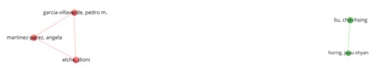 We perform a co-authorship analysis to determine the collaborating authors, organizations, and countries. Accordingly, we identify 8 out of 901 authors with at least five publications. Figure 7 illustrates this collaboration network among authors. The most collaborative researchers are Angela Martinez-Perez, Dioni Elche, and Pedro M. Garcia-Villaverde. Besides, Jeou-Shyan Horng and Chih-Hsing Liu are also co-authors. There is no co-authorship among other researchers.