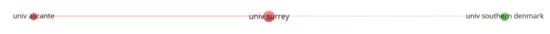 Addressing (RQ4), an attempt to explore the cooperation network of author, organization, and country, Angela Martinez-Perez, Dioni Elche, and Pedro M. Garcia-Villaverde collaborate with each other. Besides, You-Shyen Horng and Chih-Hsing Liu are also co-authors (Figure 7). Furthermore, the University of Surrey has collaborated with the University of Alicante and the University of Southern Denmark (Figure 8). In addition to these, Figure 9 illustrates the country’s cooperation network. Accordingly, countries constitute five clusters; in the first cluster, Denmark, Poland, Norway, and Sweden cooperate. In the second cluster Italy, the USA, and Turkey cooperate. In the third cluster, there is the closest cooperation network between China and Taiwan. In the fourth cluster, India and Greece cooperate, and in the last cluster, Australia and Malaysia cooperate.
