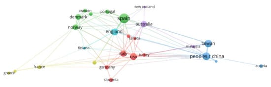 Upon examining the organization partnership, it is seen that there are 17 organizations with at least five publications out of 534 organizations. In terms of the number of publications, the University of Surrey (14 documents) ranks first in terms of the number of citations, whereas the University of Southern Denmark (741 citations) ranks first. Figure 8 illustrates the institutional collaborations. Accordingly, the University of Surrey has collaborated with the University of Alicante and the University of Southern Denmark. In terms of country cooperation, we identify 26 out of 70 countries with at least five publications. Figure 9 illustrates the country’s cooperation network. Accordingly, countries constitute five clusters. The first cluster in red includes Spain, Denmark, the UK, Portugal, Finland, Poland, Norway, and Sweden. In this cluster, Denmark, Poland, Norway, and Sweden are the countries with close cooperation. The UK, on the other hand, seems to cooperate more with Spain. The second cluster in green includes Italy, the USA, Turkey, Canada, Germany, Slovenia, and the Netherlands. The closest cooperation network in this cluster is among Italy, the USA, and Turkey. The third cluster is in blue. This cluster includes China, Taiwan, Austria, and Pakistan. In this cluster, Austria is the least cooperating country. The fourth cluster is in yellow and consists of France, Greece, South Korea, and India. In this cluster, India and Greece are the countries that cooperate most frequently. Finally, the purple cluster consists of Australia, Malaysia, and New Zealand. There is close cooperation between Australia and Malaysia in this cluster.