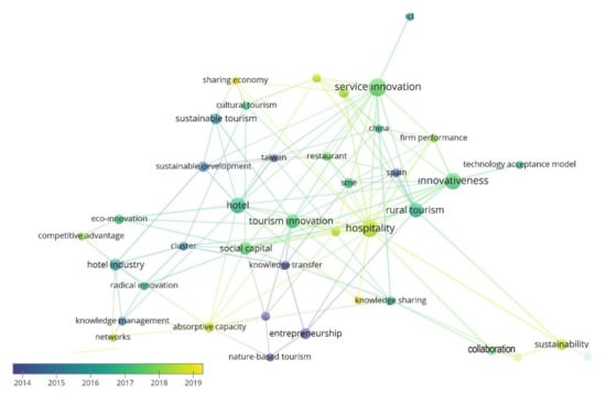 For the final research question, we employed a keyword co-occurrence analysis, or co-word analysis, to identify topical trends in the tourism innovation knowledge base. The most commonly co-occurring keywords in the review database were ‘service innovation’ (23 cases), ‘hospitality’ (20 cases), ‘innovativeness’ (19 cases), ‘hotel’ (17 cases), ‘rural tourism’ (14 cases), ‘tourism innovation’ (13 cases), ‘social capital’ (12 cases), ‘hotel industry’ (9 cases), and ‘sustainability’ (9 cases). Moreover, temporal overlay on a keyword co-word occurrence map shows the topics in which researchers have been interested recently. These topics consist of sharing economy, open innovation, COVID-19, sustainability, network, technology, co-creation, and absorptive capacity.