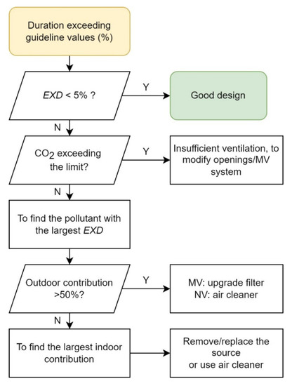 The diagnosis flow of the i-IAQ toolbox to deliver suggestions to improve the design. Y: yes; N: no; EXD: the duration exceeding the guideline values; MV: mechanical ventilation; NV: natural ventilation.