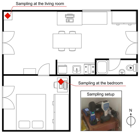 We conducted on-site continuous measurements of indoor air pollutants in the target building for a week from 3 May 2022 to 10 May 2022. We deployed two sampling stations located in the living room and bedroom, respectively (Figure 6). The sampling stations were located at a height of 1.0–1.3 m above the floor, and the locations aimed to not interfere with the daily life of the occupants. Each sampling station was equipped with two instruments recording at a 10-min interval, including one gas sensing probe (AdvancedSensePro with a DS-II probe, Graywolf Sensing Solutions, LLC, Shelton, CT, USA) measuring real-time CO2 (resolution: 1 ppm; drift: <20 ppm/year), TVOC (resolution: 2.5 μg/m3; drift: <25 μg/m3/day), NO2 (resolution: 20 μg/m3; drift: 10%/year), and O3 (resolution: 20 μg/m3; drift: 10%/6 months); and one optical particle counter (HPCC 6+, Beckman Coulter, Inc., Brea, CA, USA) measuring real-time particle concentrations. The particle counter measured number concentrations segregated into five size bins, including 0.3–0.5 μm, 0.5–1.0 μm, 1.0–2.0 μm, 2.0–5.0 μm, and 5.0–10 μm. For number-to-mass conversion, we assumed spherical particles with 1.0 g/cm3 density and constant mass-weighted size distribution within each size bin [83]. The PM10 and PM2.5 concentrations were approximated by summing up particle mass of 0.3–10 μm and 0.3–2.0 μm, respectively. All instruments went through factory calibration less than 6 months before the measurement. We implemented side-by-side measurements prior to the case study to mutually correct the disparity between the instruments.