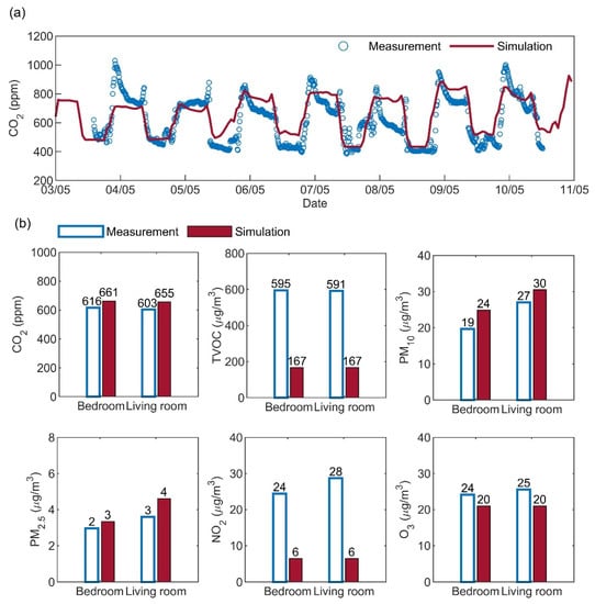 Comparisons between the simulation results from the i-IAQ toolbox and the on-site measurement in terms of (a) time-series CO2 concentration in the bedroom, and (b) average concentrations of CO2, TVOC, PM10, PM2.5, NO2, and O3 in the bedroom and living room during the case-study week.