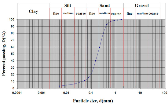 Flotation tailings, cement, and water are the basic materials used to prepare cement paste. Flotation tailings are treated as waste material obtained by processing copper ore in RTB Bor in Serbia, whose successor is the Chinese company Serbia ZiJin Copper Bor in Serbia, since 2019. Batch samples with different contents of flotation tailings, cement, and water were used. The granulometric composition of the flotation tailings was determined using a series of sieves according to the standard ISO 17892-4: 2016 [38], as shown in Figure 1.
