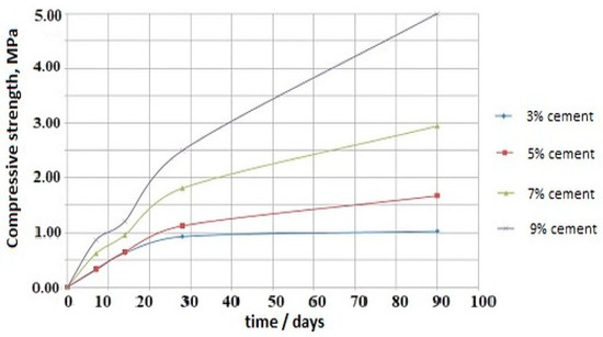 Belem et al. [46] and Hefni et al. [36] in their work provided results of UCS testing on traps after different maturing times (curing) (7, 14, 28, and 90 days) and the application of different binders. Belem et al. [46] concluded that UCS increases from 1000 to 2500 kPa after 56 days of maturation if the content of a particular binder increases from 3% to 6%. Hefni et al. [36] came to a similar conclusion because in their case, after 28 days, UCS increased from 200 to 1200 kPa with only a change in the content of the applied binder. We reached a similar conclusion in the experiment described in this paper, since by changing the content of cement as a binder (from 3% to 9%), without changing the water content, we observed an increase in UCS from 925 to 2497 kPa after 28 days of maturation.