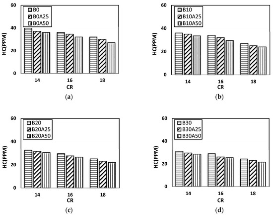 - For the same CR and load, a 37% decrease in CO emission and a 31% reduction in HC emission was noticed as compared to that of pure diesel fuel for the same CR and load, while, when compared to B20, about a 16% reduction in CO and a 12% reduction in HC emission were observed.
