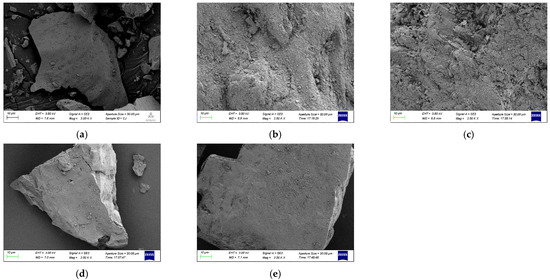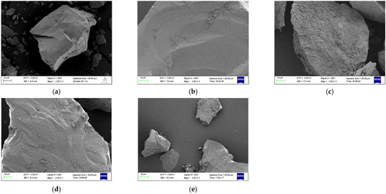 To analyze the effect of ionic liquids on the micromorphology of the ore samples, the ore samples inhibited by ionic liquids were magnified to a magnification of 2K using a Sigma 300 electron scanning microscope, as shown in Figure 2 and Figure 3, with the control group treated with water in Figure 2 and Figure 3a. It can be seen that in the control group (a), the surface of the ore sample particles is flat with a few fine particles present around it, and the pore structure is not apparent. Compared with the control group samples, some pores appeared on the surface of the samples after inhibition, the surface roughness increased to different degrees, and the fine particles attached around the large particles increased. In general, the surface morphologies of the samples treated with different ionic liquids are quite different; the surface is looser than the unhindered samples, and the number of fine particles on and around the large particles had also increased.