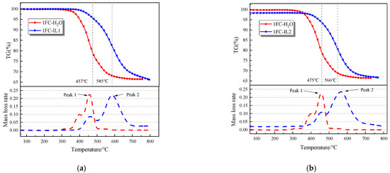Two peaks can be found in the weight loss rate curves of both the control samples and some of the 1FC samples treated with ionic liquids, and the temperatures of the two peaks are relatively close. This indicates that two oxidative weight loss reactions occurred successively in these samples during the oxidative spontaneous combustion stage. These two weight loss reactions may be Equations (10) and (11), and the theoretical weight loss of Equations (10) and (11) are 33.3% and 66.7%, respectively. After combining the thermogravimetric curves with the mass fraction of FeS2 in the sample, we found that the actual weight loss of the sample was consistent with the theoretical weight loss of the two reactions of Equations (10) and (11).