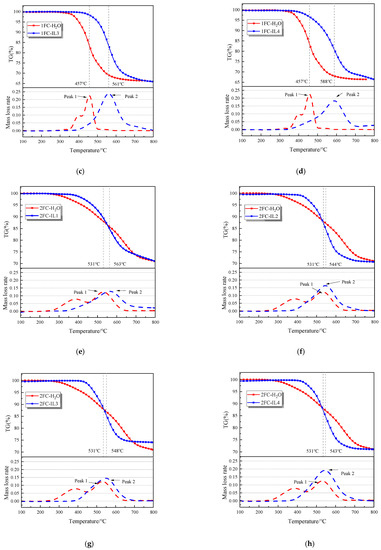 TG curves of ore samples treated with ionic liquids. (a) 1FC-H2O and 1FC-IL1; (b) 1FC-H2O and 1FC-IL2; (c) 1FC-H2O and 1FC-IL3; (d) 1FC-H2O and 1FC-IL4; (e) 2FC-H2O and 2FC-IL1; (f) 2FC-H2O and 2FC-IL2; (g) 2FC-H2O and 2FC-IL3; (h) 2FC-H2O and 2FC-IL4.
