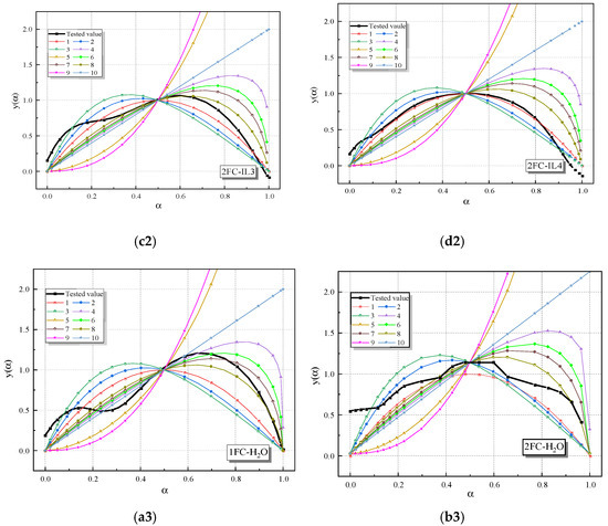 The fitting curve of the reaction mechanism function for the two kinds of ore samples before and after treatment. (a1) 1FC-IL1; (b1) 1FC-IL2; (c1) 1FC-IL3; (d1) 1FC-IL4; (a2) 2FC-IL1; (b2) 2FC-IL2; (c2) 2FC-IL3; (d2) 2FC-IL4; (a3) 1FC-H2O; (b3) 2FC-H2O.