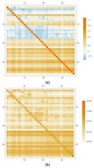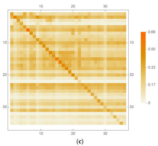 To obtain a general picture of the basic elements of the analysis, in Figure 1, Figure 2 and Figure 3 we provide the matrix plots of the output, employment, and import multipliers (see Equations (9)–(11), respectively) of the US economy. Commodities 1–4 belong to primary production. Commodities 5–22 belong to industry. Commodities 23–36 belong to services.