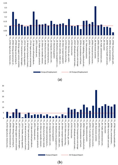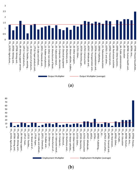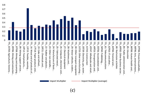 Based on the previous analysis, and using data from the input–output (IO) table of the US economy for the year 2015, we estimate the output, import, and employment multipliers for the 36 different commodities/sectors that are described in the IO table (Figure 2). The first column of Figure 2a–c indicates that a change of 1 monetary unit in the demand for “Agriculture, forestry and fishing” induces a change of 1.32 units in product output, a change of 12.76 employment units, and a change of 0.22 units in imports, respectively. The remaining columns of these figures are constructed in a similar way. Hence, a change of USD 1 million in demand causes an average change of USD 1.35 million in product output, a change of 12.87 persons employed in the production, and a change of USD 0.28 million in imports. (All the detailed empirical results are available on request. It is also noted that the construction of the relevant empirical variables necessary for the empirical analysis was based on the usual procedure followed in other similar studies in the field (see, e.g., Mariolis et al. [28], Appendix A1).)
