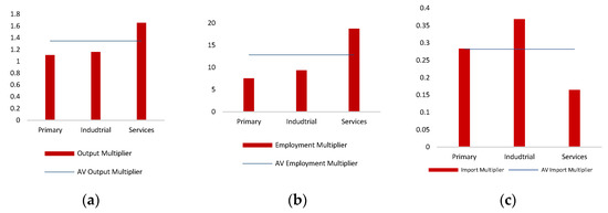 We observe that the key commodities for effective demand management policy are “Mining support service activities”, “Construction”, “Wholesale and retail trade; repair of motor vehicles”, “Transportation and storage”, “Accommodation and food services”, “IT and other information services”, “Other business sector services”, “Public administration and defense; compulsory social security”, “Education”, “Human health and social work”, “Arts, entertainment, recreation and other service activities”, and “Private households with employed persons”. Hence, leaving aside the construction sector, all the key commodities detected in the US economy correspond to sectors of services. This finding is not unexpected if we consider the structure of the matrix multipliers of the US economy (see also Figure 1 above). These commodities are characterized by output and employment multipliers that are above the economy’s average and, at the same time, by import multipliers that are below the economy’s average. Thus, the economic policy authorities could implement an effective demand management policy by stimulating demand for these commodities. Such a policy could lead to a significant increase in output and employment without affecting in a negative way the external sector of the economy. To further delve into this finding, in Figure 3 we present the average output, import, and employment multipliers for primary production, industry, and services.