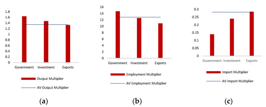 The multipliers of (a) output, (b) employment, and (c) imports for government, investments, and exports of the US economy.