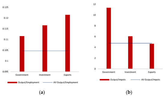 A demand policy can be applied by government expenditures, investments, or exports. Therefore, it is important to decompose the elements of total demand and to study the multiplier effects of each component separately. In this regard, the available data from the OECD split total final demand into the government’s final consumption expenditure, (government hereafter), gross fixed capital formation (investments hereafter), and exports. (For the multiplier effects of tourism in the US economy, see Rodousakis and Soklis [29].) Figure 6 provides our estimation of the multiplier effects per category of the final demand of the US economy. It is observed that the government can be considered as the main agent for a demand policy. As there is, in the case of investments, a short distance between the employment multiplier and the economy’s average, we can also consider investments as an effective tool for boosting growth and employment.