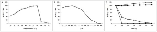 The purified enzyme of Y. lipolytica had maximum activity at 60 °C and pH 4.5, while at 65 °C nearly 90% loss of activity was observed (Figure 1A,B). This corresponds to the maximum of invertase activity isolated from the industrial strains of baker’s yeast S. cerevisiae [6]. Additionally, another S. cerevisiae strain, NRRL Y-12632, produces invertase showing maximum activity at pH 6.0 and at 50 °C [35]. Depending on the origin of invertase, a broad range of optimal pH from 2.6 for F. solani to 6.0 for S. cerevisiae and C. cladosporioides was described [17,18,19,23,35]. The same situation was observed for the optimal temperature of invertase activity ranging from 30 °C for L. antarcticum and A. flavus to 70 °C for C. utilis, X. dendrorhous, and C. cladosporioides [14,18,19,20,21,22,23].