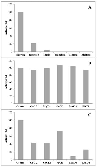 The effect of metal ions on the activity of a purified extracellular invertase is shown in Figure 2B,C. The enzyme was strongly inhibited by Zn2+, Cu2+, and Fe3+ in the reaction mixture. The inhibitory effect of these metal ions confirms that acidic amino acids, as well as cysteine, play an important role in the invertase active site [19,35,40]. However, there are also examples of invertases which are not affected by metal ions, or even show an increase in their activity in the presence of Zn2+ and/or Cu2+ [12,17]. The effect of the other tested metal ions and EDTA on the activity extracellular invertase was negligible (Figure 2).