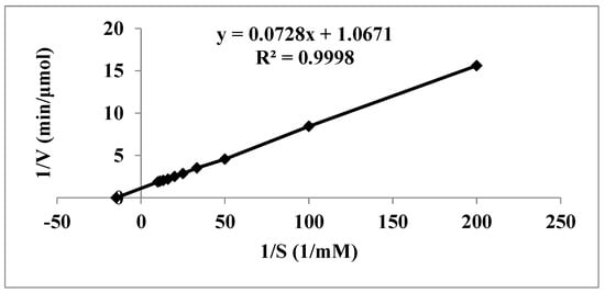 The Michaelis–Menten constant (KM) and maximum reaction rate (Vmax) were calculated from Lineweaver–Burk plot, as a function of the sucrose concentration (0.005–0.1 M) at pH 5.0.