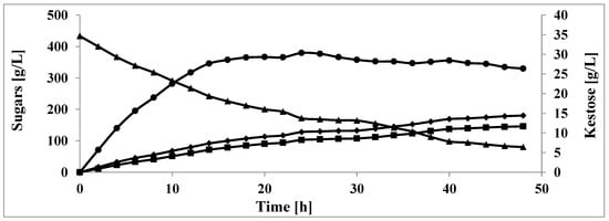 Next, the transfructosidase activity of the analyzed invertase in high sucrose concentration (500 g/L) was investigated. Fructooligosaccharides (FOS) are oligosaccharides with the number of fructose units ranging from 2 to 60, terminated by glucose unit. They are not hydrolyzed by small intestinal glycosidases and are considered as soluble dietary fiber. Furthermore, FOS have important beneficial physiological effects such as low carcinogenicity and prebiotic effect, improving mineral absorption, and decreasing levels of serum cholesterol, triacylglycerols, and phospholipids [41]. The heterologous invertase expressed by Y. lipolytica was able to synthesize up to 30 g/L of 1-kestose within 24 h (Figure 4). After this period, the concentration of kestose slowly decreased. The critical point of invertase transfructosylating and hydrolytic activity was at 17% of sucrose concentration in the reaction mixture. The 1-kestose was the unique FOS produced by Y. lipolytica invertase. The study of FOS expressed by S. cerevisiae invertase showed that this enzyme is able to generate five different molecules: 1-kestose, 6-β-fructofuranosylglucose, inulobiose, 6-kestose, and neokestose in aqueous and anhydrous organic media [42,43]. Similar products were obtained during FOS synthesis by invertase from R. dairenensis [1]. The maximum concentration of FOS (87.9 g/L) was reached at 71 h at 13% of sucrose concentration in the reaction mixture and contained 6-kestose (68.9 g/L), neokestose (10.6 g/L), 1-kestose (2.6 g/L), and tetrasaccharides (12.7 g/L). It is possible to obtain 101 g/L of FOS by the invertase from Sch. occidentalis, where 6-kestose and 1-kestose concentration reached the level of 76 and 25 g/L, respectively [4,44].