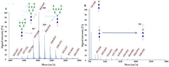 Mass spectrum of undigested N-glycans released from heterologous invertase expressed in Y. lipolytica (A) and α-mannosidase digested N-glycans from membrane proteins (B). M7, M8, and M9 indicate the number of mannose molecules. ●—mannose, ■—N-acetylglucosamine, ○—hexose.