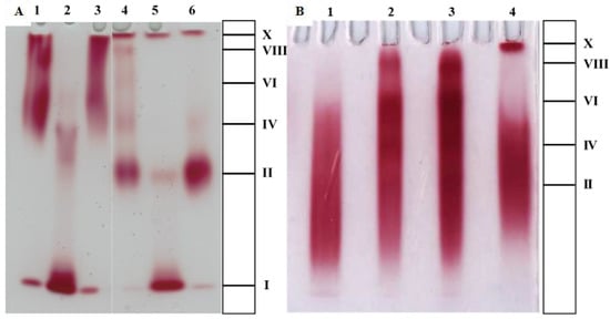 Zymogram of PAGE Y.lipolytica invertase. (A) N-glycan influence on external invertase polymerization; S. cerevisiae invertase lanes (1–3), Y.lipolytica A-101-B56-5 invertase lanes (4–6); lanes (1, 4) not incubated; lanes (2, 5) incubated 3 h at 37 °C with EndoH; lanes (3, 6) incubated 3 h at 37 °C without EndoH. (B) Effect of carbon source on Y. lipolytca A-101-B56-5 invertase polymerization: lane: (1)-glucose, (2)-glucose+fructose, (3)-sucrose, and (4)-glycerol. I—X invertase polymers position (monomer to decamer, respectively).