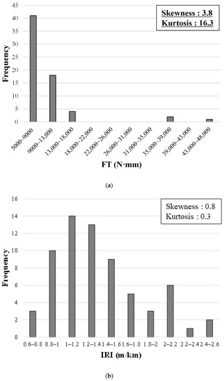 Figure 4 shows the distribution of the dependent variable (FT) and independent variables (IRI, RD, SD, and ESAL), and their respective skewness and kurtosis. The distribution of IRI (skewness: 0.8; kurtosis: 0.3) and RD (skewness: 0.5; kurtosis: −0.5) satisfied the normality visually, and their skewness and kurtosis satisfied the normality criteria. The distribution of ESAL dissatisfied the normality visually because there was relatively little data in the middle part. However, the skewness and kurtosis of ESAL were 0.6 and −1.3, respectively, satisfying both criteria of normality. Meanwhile, FT and SD showed a distribution with the data concentrated on small numbers. Their skewness was 3.8 and 4.4, and their kurtosis values were 16.3 and 22.6, respectively; thus, they did not meet the normality criteria.