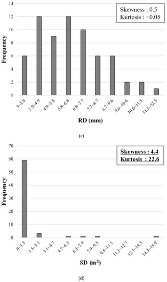 We calculated the kurtosis, which represents the degree of concentration of the data of a variable, using Equation (2). The distribution of the data approaches a normal distribution if the kurtosis approaches an absolute value of 3. The degree of concentration increases if the kurtosis becomes smaller than the absolute value of 3 and decreases if the kurtosis becomes larger than the absolute value of 3 [17]. Although data with skewness close to zero and kurtosis close to the absolute value of three shows high normality, ordinary data cannot satisfy the criteria. Therefore, data with skewness less than the absolute value of 3 and kurtosis less than the absolute value of 10 were set as the criteria for normality, as suggested by Kline [18].