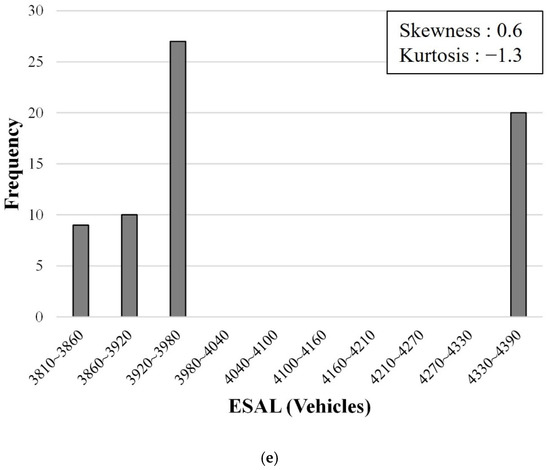 Frequency distribution of raw data of variables. (a) FT, (b) IRI, (c) RD, (d) SD, (e) ESAL.