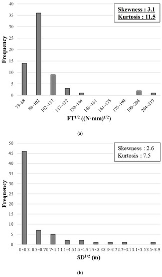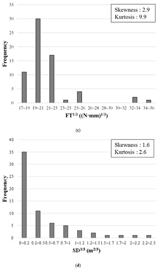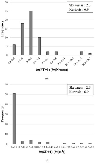 If the data do not satisfy the criteria for normality, they can be adjusted to achieve normality by applying square roots, cube roots, or logarithms [19,20]. We visually verified the distributions of FT and SD after applying the square root, cube root, and logarithm, as shown in Figure 5, and examined their skewness and kurtosis. The distribution of the square root of FT in Figure 5a shows skewness and kurtosis of 3.1 and 11.5, respectively; thus, the criteria for normality were not met. However, the square root of SD in Figure 5b shows skewness and kurtosis of 2.6 and 7.5, respectively, both of which satisfy the normality criteria. The cube root of the FT (in Figure 5c) and SD (in Figure 5d) and the logarithm of the FT (in Figure 5e) and SD (in Figure 5f) satisfied the criteria for normality. Consequently, we developed the FT prediction models by using dataset 1, comprising the actual values of IRI, RD, and ESAL, the cube root of FT, and the cube root of SD. We also used dataset 2, comprising the actual values of IRI, RD, and ESAL, the logarithm of FT, and the logarithm of SD, as shown in Table 1.