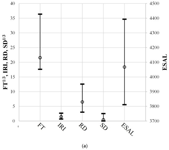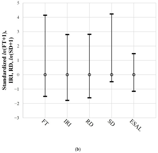 We used the IRI, RD, SD, and ESAL as the independent variables of the FT prediction model because they had a mechanistic relationship with the FT; we measured them every year during HPMS surveys. The distributions of FT and SD did not satisfy normality; therefore, they were normalized. The mean and standard deviation of all variables were standardized.