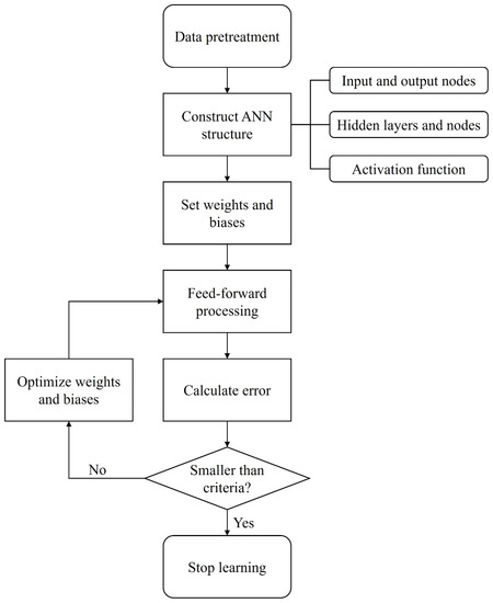 Figure 8 shows the procedure for constructing the ANN model with the optimal weight and bias, minimizing the error. First, we conducted pretreatment normalizing and standardizing of the data for each variable and determined input layers with input nodes, hidden layers with hidden nodes, output layers with output nodes, and activation functions at each hidden node to construct the ANN structure. Subsequently, we randomly set the weights and biases connecting the nodes in different layers. Using feed-forward processing, the input values are fed into the input nodes to generate results at the output nodes after passing through hidden nodes, weights, and biases. If the errors between the predicted and measured values are larger than the criterion, weights and biases are optimized using an appropriate optimizer and feed-forward processing is repeated until the error became smaller than the criterion.