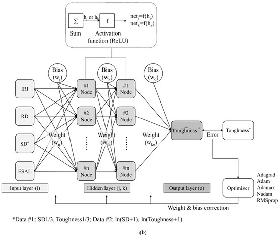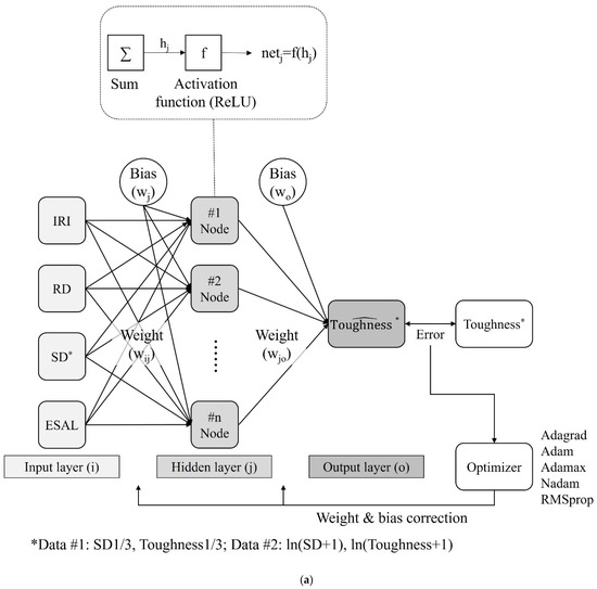 Figure 9 shows the constructed ANN model. The input layer comprises four nodes for IRI, RD, SD, and ESAL, and the hidden layer comprises one or two layers, as shown in Figure 9a,b). The activation function at each node in the hidden layers assigns a nonlinearity to the model. In the ANN model with multiple layers, the sigmoid function—the most basic activation function—can cause a gradient vanishing problem, in which the adjusted values of the weights and biases converge to zero [23]. The proposed ANN model comprises multiple layers. Therefore, we used a rectified linear unit (ReLU) based on Equation (6) as the activation function because it does not cause the vanishing gradient problem and has been used in the most extensive scope of research [24]. The output layer consists of one node that outputs the predicted FT. The model could correct the weights and biases by using an appropriate optimizer when the error between the predicted and measured values is larger than the criterion.