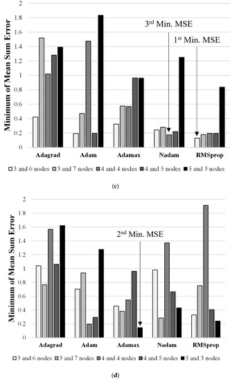 Minimum MSE calculated by trained model according to ANN structures and optimizers. (a) Dataset 1 and one hidden layer, (b) Dataset 2 and one hidden layer, (c) Dataset 1 and two hidden layers, (d) Dataset 2 and two hidden layers.