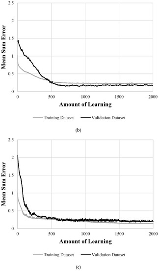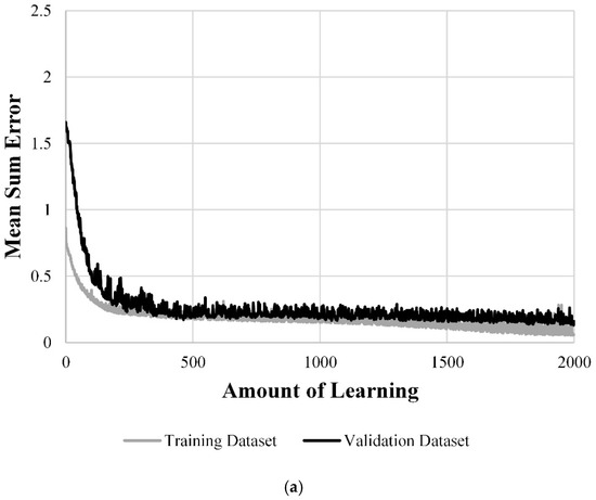 The hyperparameter, adjusted by training, is the weight and bias between each layer in the ANN model [25]. The prediction performance of the ANN model using the training dataset improves, whereas the one using the validation dataset deteriorates, causing overfitting when the hyperparameter is too large. However, errors caused by both the training and validation datasets increase when the hyperparameter is too small. Therefore, an appropriate number of hyperparameters should be used to limit the number of hidden layers and nodes [26].