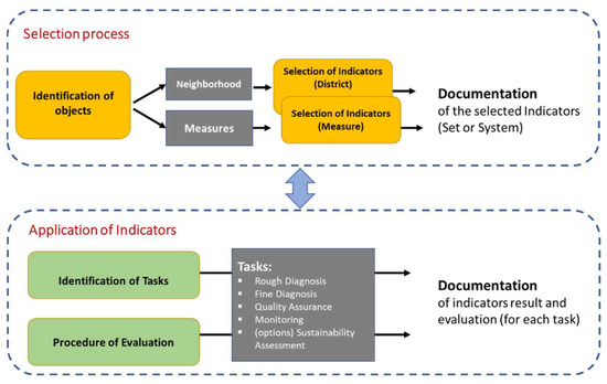 In contrast, regarding the further development of existing neighbourhoods, individual questions of analysis, evaluation, and improvement demand more flexible assessment approaches, which are capable of involving the inhabitants impacted and their individual needs and interests [61]. In this case, open sets of criteria and indicators are more often applied, depending on stakeholder interest and perspective, as well as available data. Regarding this, criteria and indicators can be individually selected or additionally developed and introduced [7]. This approach follows a more process-based and participatory approach [62]. The object of assessment is usually an individual measure, which is, however, also evaluated with regard to its effects on the overall system.
