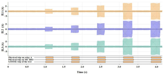 Now, new signals are injected according to the programmed fault events to study the response of protection relay A with MU B. Table 4 presents the average times (T) and the standard deviation (σ) calculated for the three measurement points defined in Table 2 (physical contact in the relay, GOOSE tripping messages, and physical contact in the MU). The term I corresponds to the fault currents of the five events defined in Table 2. The term T corresponds to the average time measured throughout the 10 tests performed per event. The term σ is the standard deviation of the times measured in the 10 tests performed per event. Moreover, times are measured in the communication network for the GOOSE tripping messages predefined by factory (Factory GOOSE) and set for the test (Set GOOSE).