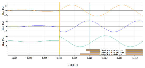 Figure 4 shows the segment that relates the times of the protection relay A with MU A, for the third fault event starting at 2.40 s. The pre-fault current is 700 mA (RMS), and the fault current is 4.2 A (RMS) at 2.4 s. In the lower part of this figure, the digital signals registered from the start of the fault are presented, representing the response action of the protection relay A. In this zone, the response time for the electrical protections is measured, considering the fault initiation at 2.4 s and establishing the delay generated at the same point. An average response time is consolidated from this difference, including all the repetitions made for this test.
