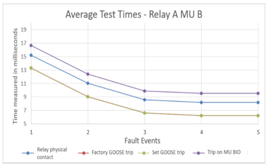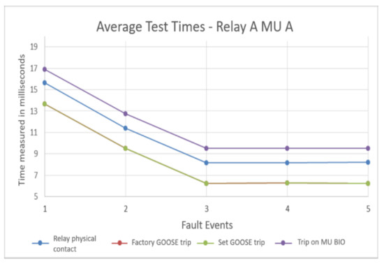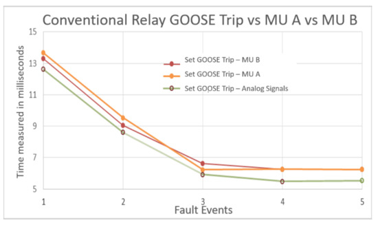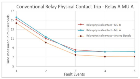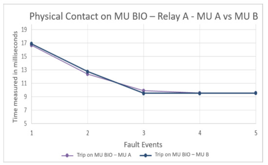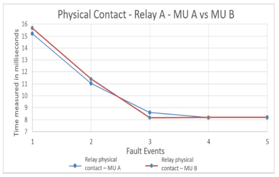 The variables measured in the protection relay A for the two test scenarios are carried out to observe the implications of using this equipment in a system with a process bus. Then, Figure 7 shows the average times for the actuation of physical contact in protection relay A with MU A and MU B. This test compares how these times are altered by changing analog MUs A and B, responsible for converting analog current and voltage signals to SVs. Then, these new SVs are transmitted to the protection relay through a communication network. This figure displays the times when the physical contact is activated in the protection relay A for the five fault events. The result shows that times are similar, with a small-time lag lower than 0.5 milliseconds. In addition, the signal is not affected significantly by the MUs, and it could be more associated with data traffic in the network and not with SV transfer.