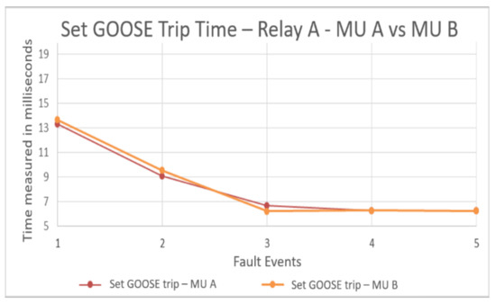 The result shows that the times and the trend lines are similar, and the differences are less than 0.5 milliseconds. This result can be associated with the traffic variation in the communication network or saturations because of the amount of GOOSE tripping messages or SVs from the MUs. Minimum differences were found when comparing the response times in both MUs, and the delays are linked to traffic problems in the communication network.