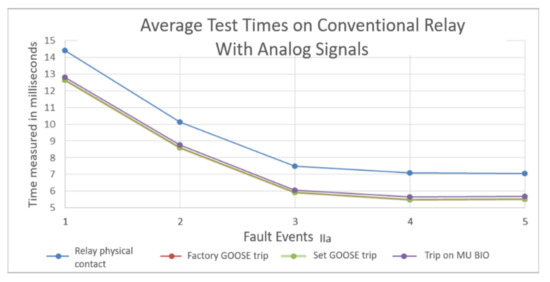 Figure 6 shows the average times measured for the protection relay A with MU B. The trend lines and points corresponding to the average time obtained with the two GOOSE tripping messages issued by the protection relay are overlapped, denoting that they are the same. The response time measured in the digital MU is higher than those values previously found in the tests. The time difference between the GOOSE tripping messages in the digital MU does not exceed four milliseconds in test scenarios. This result implies that the signal processing and device activation, added to the traffic in the network, is less than one-quarter of the cycle of a 60 Hz sine wave. However, when the response times of the MU and the activation of the physical contact in the protection relay are compared, the difference is minimal and does not reach 1.5 milliseconds. This result shows that the digital MU is an element that does not affect the final response time of the protection relay.