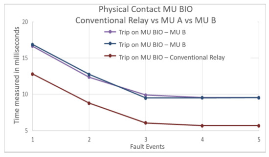 Then, the average times measured for the physical contact in the protection relay B with conventional signals and the response times obtained with protection relay A with the two MUs are plotted in Figure 11. Likewise, the corresponding trend lines are included for each exposed variable. In this illustration, the time values measured for the conventional protection relay B are short compared to the points found for the protection relay A operating with SVs of the MUs. However, the response times compared in all fault events do not present a difference larger than 1.5 milliseconds. This behavior means that the protection relay operation in an electrical substation with a process bus, according to IEC 61850-9-2, presents a similar response to conventional electrical protection that operates with analog signals.