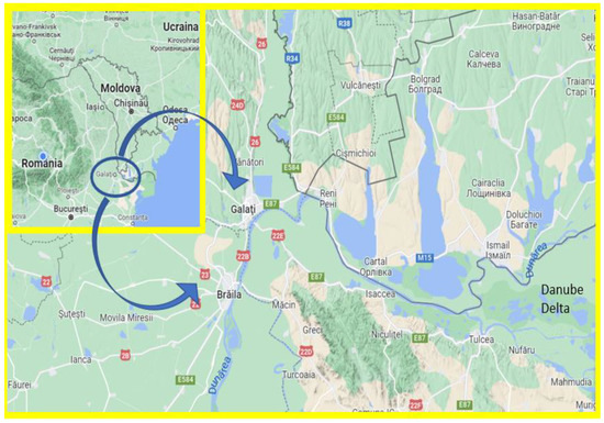 The geographical location of Galati-Braila Conurbation (source: https://www.google.com/maps/@45.3465904,28.0314487,10z (accessed on 15 May 2022)).