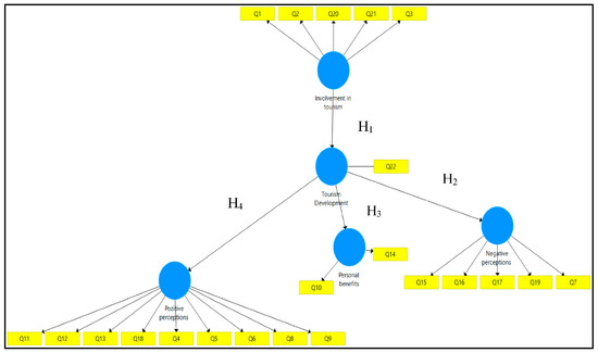 The specific objectives aimed to establish the effect coefficients between the latent variables considered in the study: involvement in tourism; tourism development; personal benefits; positive perceptions; and negative perceptions.