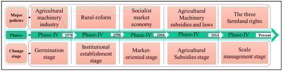 Over the last six decades, China has considered mechanization a fundamental tool and strategic goal for building a modern socialist agriculture system [27] and the need for food security and increasing rural incomes have been the two most important factors driving the development of mechanization in the country. In this article, the evolution and development trend of China’s mechanization are classified into five major phases since 1949, based on the changes in major socio-economic policies that have directly or indirectly affected that mechanization development, because rapid mechanization happened when the government made the appropriate political and economic reforms [28]. Figure 2 presents the five major phases of mechanization development in China associated with the major economic policy events.