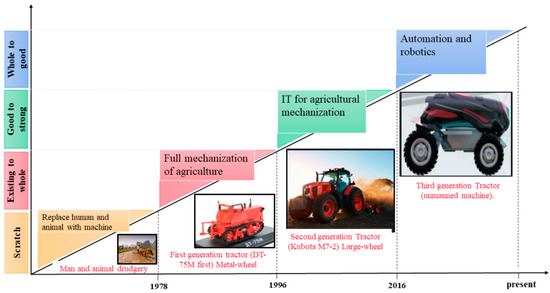 China is attempting to fully mechanize the overall agricultural production chain and the mechanization level at the production stage has been far higher than at the pre- and post-production stages. In 1996, the government relaxed the market system and agricultural tractors were imported from other countries. The local manufacturing industry also paid more attention to producing tractors within the country. The integration of information technology with agricultural mechanization to modernize agriculture has, thus, become the priority issue for agricultural policy and strategies. Since 2016, advanced technology, such as automation and artificial intelligence, has been promoted in various research and academic institutions. As it can be seen in Figure 3, China’s mechanization development follows the step-by-step principle, which has failed in the other developing countries with small-scale agriculture that have attempted it.