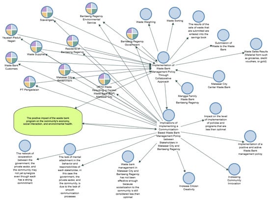According to the Regulation of the Minister of Environment, Republic of Indonesia Number 13 of 2012, a waste bank is a place for sorting and collecting waste that has economic value for reuse. The waste bank is a collective dry waste management system that encourages active community participation [16,17,18]. This program is a collaborative approach that examines the implementation of waste bank policies in Makassar City and Bantaeng Regency as part of integrating community-based waste bank (WB) policies in urban areas. It is a national program of the Ministry of Environment in the context of realizing environmentally friendly regencies/cities towards sustainable development. The technical service unit (UPT) of the waste bank has a waste management function that can be utilized due to its economic value [19,20]. Therefore, local governments are expected to play a greater role in encouraging public, private, and other stakeholders through a collaborative approach by strengthening communication between actors in waste management.